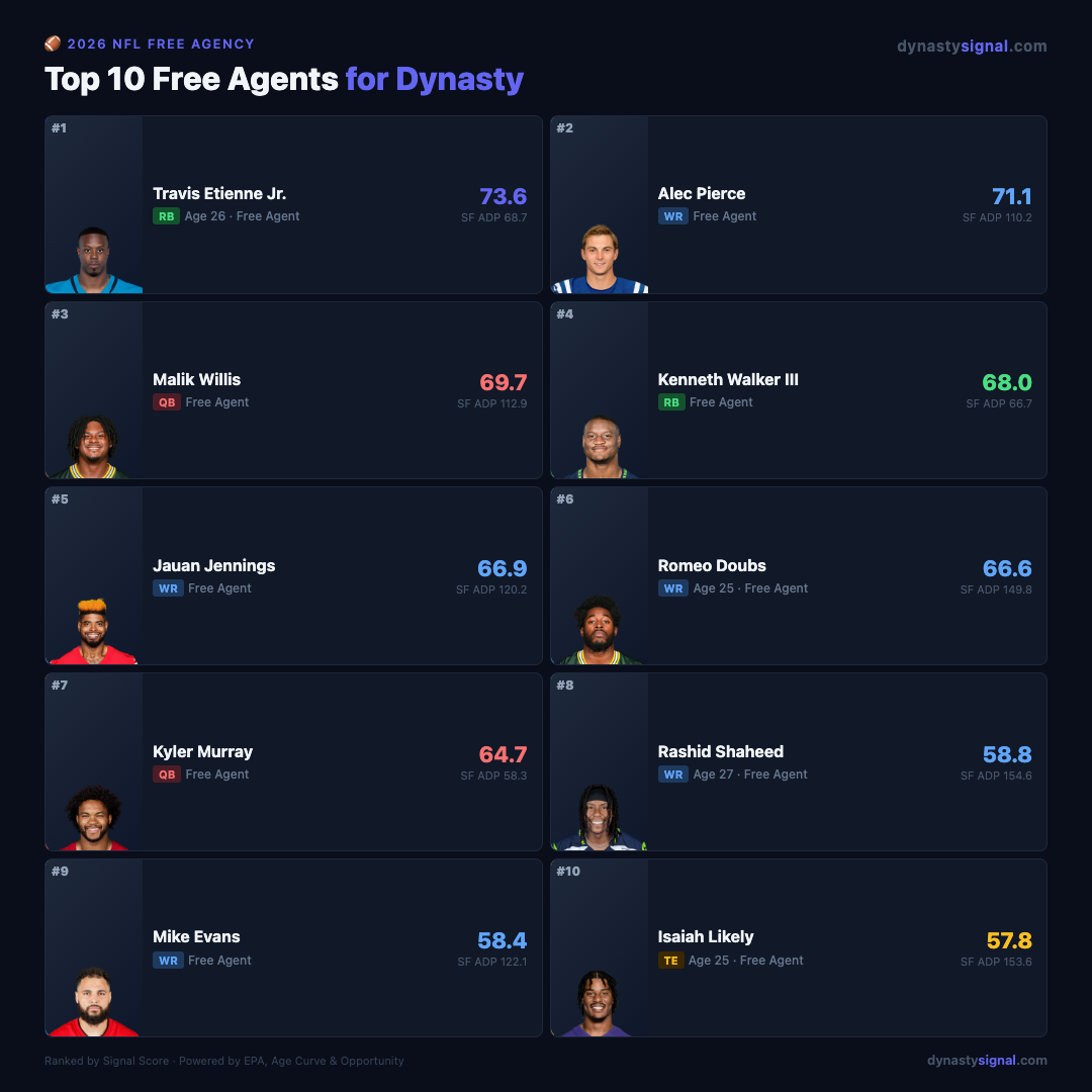 NFL free agency moves fast. One signing press conference and a player's dynasty value doubles — or craters. Before the dust settles, here's where our model has the top available players ranked heading into the frenzy.