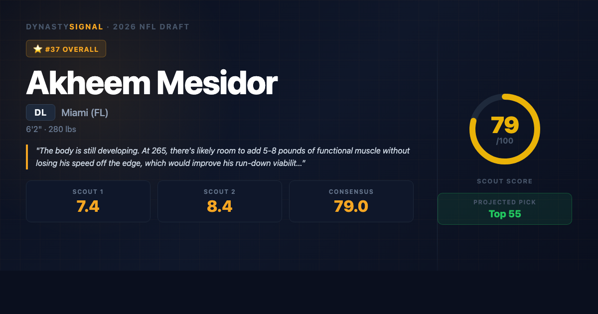Scout1 Assessment Akheem Mesidor is a premium-sized power-speed EDGE rusher who plays with elite length, legitimate bend, and a high motor that shows up in the fourth quarter of big games. The case for him is straightforward: 6'5", 265 lbs with the ability to turn the corner and make NFL tackles look foolish in one-on-one matchups — that combination doesn't grow on trees. The case against is that his sack production (7.0 in 2025) is modest for a first-round conversation, his pad level bleeds high on run plays mor...