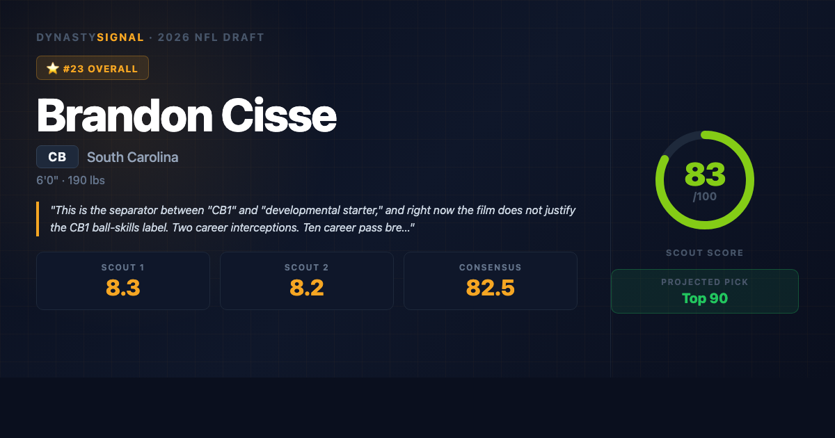 Scout1 Assessment Brandon Cisse is the press-man boundary corner that NFL teams dream about drafting โ 6'0", elite straight-line speed, long arms, and the physicality to jam at the line in the SEC. Multiple credible draft analysts including Todd McShay have him penciled in as the CB1 in the 2026 class, and on raw athletic and schematic fit grounds, that argument holds up. The case against: his ball production is thin for a supposed top-five CB (2 career interceptions, 10 career PBUs), his hand technique at the ca...