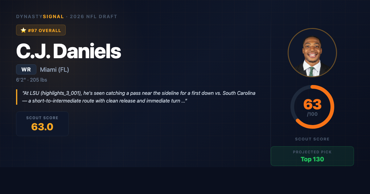 C.J. Daniels has done something most receivers never pull off: he's been legitimately productive at three different programs โ Liberty, LSU, and Miami โ against three very different levels of competition, and he's heading into the 2026 NFL Draft with 198 career receptions, 2,996 yards, and 28 touchdowns to his name. Those numbers weren't compiled against cupcakes. His 2025 Miami season ran through Notre Dame, FSU, Florida, Louisville, and a College Football Playoff run that stretched to 13 games. The final tally โ 50 catches, 557 yards, 7 touchdowns โ doesn't scream alpha receiver, but the film tells a more nuanced story.