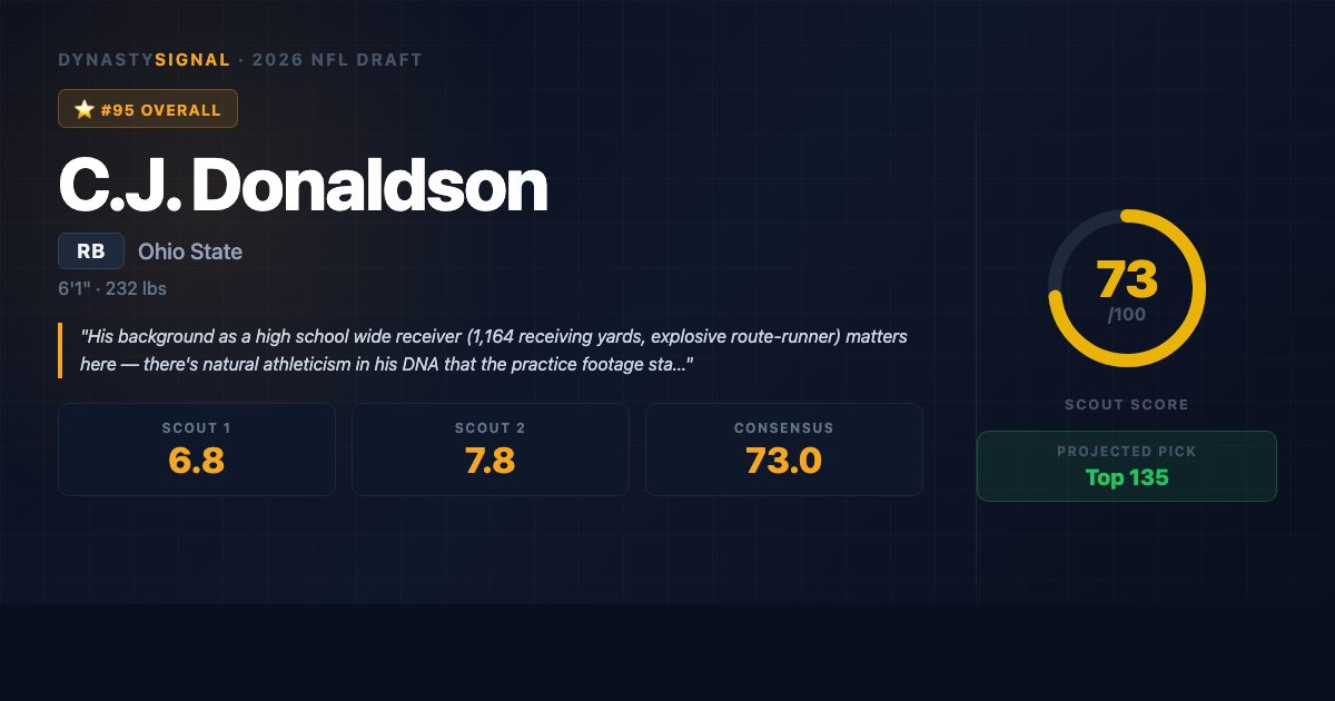 C.J. Donaldson doesn't fit neatly into a box, and that's exactly why dynasty managers should be paying attention. A former high school wide receiver โ 81 receptions, 1,164 yards, 13 touchdowns as a prep senior โ who arrived at West Virginia and was immediately moved to running back, Donaldson spent three seasons proving he belonged before making the hardest kind of transfer: walking into Ryan Day's Ohio State program as a depth-chart afterthought and still scoring 10 touchdowns on a national championship team. Forty career rushing touchdowns across two Power conferences. That kind of production doesn't happen by accident.