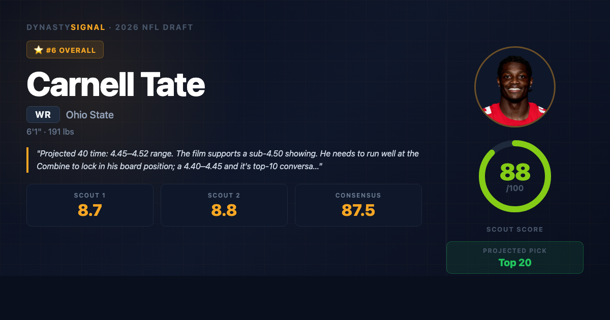 Scout1 Assessment Carnell Tate is a long-striding, technically advanced outside receiver who spent the 2025 season establishing himself as one of the best-kept secrets in the country β sharing a receiver room with Jeremiah Smith, Emeka Egbuka, and the shadow of Marvin Harrison Jr. He is not a secret anymore. At 6-3, 195 lbs, Tate combines legitimate deep-threat speed, disciplined route technique, and above-average hands into a profile that translates cleanly to the NFL. He is the most improved player in the 2026 ...