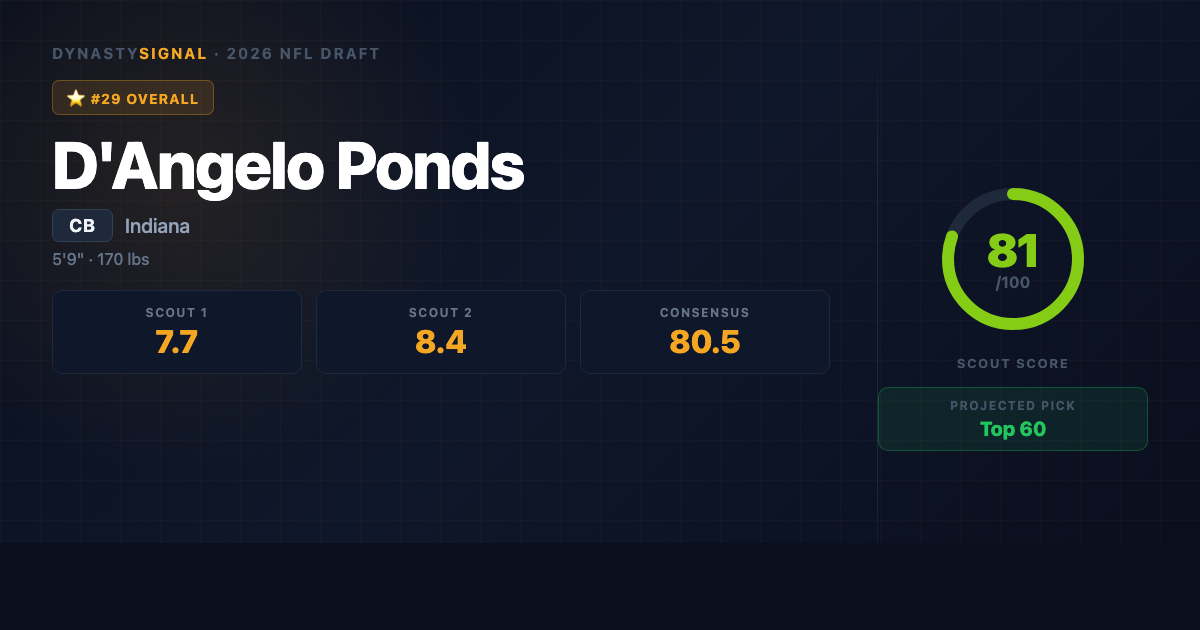 D'Angelo Ponds made his statement on the first play of the biggest game of Indiana's historic season. When Oregon took the field for their CFP Peach Bowl semifinal opening drive, Ponds read the quarterback's eyes, got into the throwing lane before the ball was even released, and turned the interception into a pick-six โ a play that announced him as one of the best defensive backs in college football and the most important defender on a 14-0 Big Ten championship team. By the time the 2025 season concluded, Ponds had compiled 55 tackles, 4.5 tackles for loss, 3 interceptions, and 9 pass breakups โ production numbers that say everything about a corner who attacks the football rather than spectating.