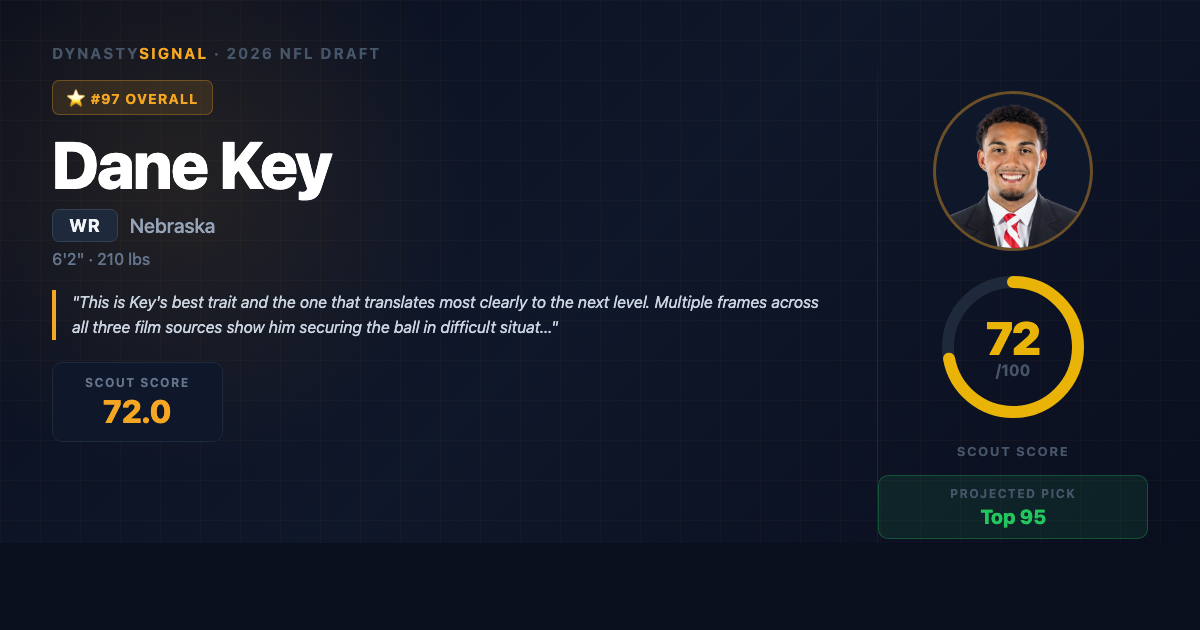 Scout1 Assessment Dane Key is a 6'3", 210-pound boundary receiver who transferred from Kentucky to Nebraska after three productive SEC seasons — 126 catches, 1,870 yards, and 14 touchdowns across 38 games against legitimate competition. The case for: he's a long-striding vertical threat with legitimate contested-catch ability at the catch point, shows body control along the sideline, and doesn't shy away from physical situations against elite coverage (Alabama, Auburn, Georgia). The case against: his athletic pro...