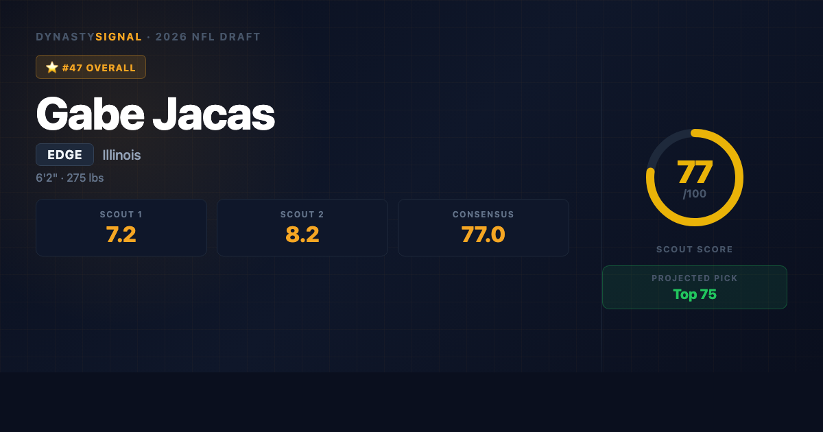 Jacas projects as a rotational EDGE/5-technique in Year 1 in a gap-control or power-run defensive front. The 2026 rookie draft market will undervalue him relative to his production because EDGE prospects from Illinois do not generate the same dynasty buzz as players from Ohio State, Georgia, or Alabama. That market inefficiency is the buying opportunity โ his production numbers at the Big Ten level are legitimate, his hands and motor will translate, and the developmental ceiling of a Trey Hendrickson-type late-bloomer keeps the upside live through his first NFL contract.
