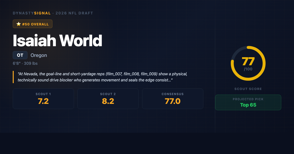 The two scouting reports landed 10 points apart — a genuine divergence worth noting. Scout 1 scored World at 72/100 and projects him in the Pick 50–65 range, leaning on technical soundness and a Dion Dawkins-type floor: a reliable starting tackle who maximizes a run game without necessarily being a franchise blindside cornerstone. Scout 2 scored him at 82/100 (Pick 35–50), weighting his physical power profile more heavily and projecting Jawaan Taylor as the ceiling — with Cam Robinson as the cautionary floor if pass protection doesn't develop. DynastySignal's blended score of 77.0/100 and projected range of Pick 35–65 reflects that honest split. For dynasty purposes, landing spot is everything — World in a run-heavy AFC North scheme is a very different asset than World tasked with protecting a pass-first quarterback on 40 dropbacks a game.