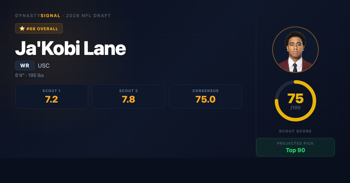 Scout 1 grades Lane as a legitimate draft asset with an overall score of 72/100 and a projected pick of Round 3 (picks 65โ90). The evaluation is bullish on his catch radius, body control, and red-zone instinct โ grading his hands at A- and his size-athleticism combination at A โ while flagging route running (C+/B-) and speed (B) as the primary development areas. The pro comp is George Pickens, which is apt: elite contested-catch ability, elite body control, developing route nuance, and a WR3 floor with WR2 upside if the mental game catches up to the physical tools. Scout 1's dynasty recommendation is to buy in the late second round of rookie drafts โ high enough to avoid missing him, not so high you overpay for a projection.