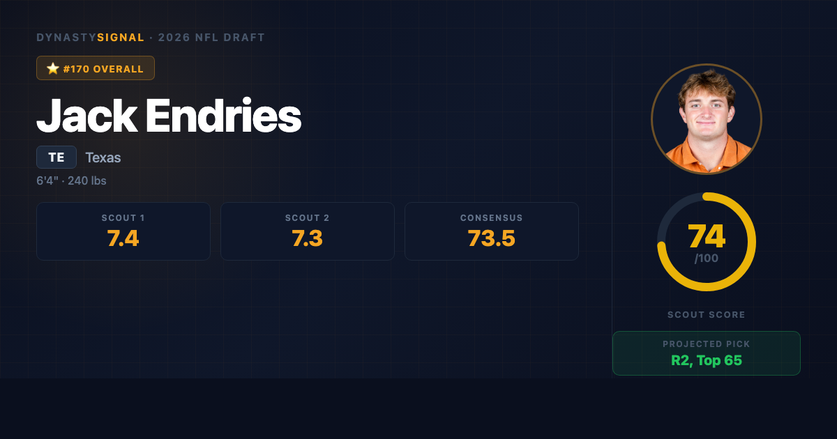 His production arc also raises a mild flag worth acknowledging. Going from 56 receptions and 623 yards at Cal to 33 receptions and 346 yards at Texas β despite playing in what is theoretically a superior offensive system with a more talented quarterback β suggests target-share competition may have limited his opportunity more than scheme fit elevated it. Texas ran one of college football's deepest skill rosters, and Endries competed for targets against elite wideout talent. That context explains the volume dip, but dynasty managers should note that his ceiling is heavily scheme-dependent: in a pass-first NFL offense that leverages the TE seam as a primary concept, he's a potential TE1. In a power-run system asking him to in-line block 60% of the time, his weekly fantasy floor drops considerably.