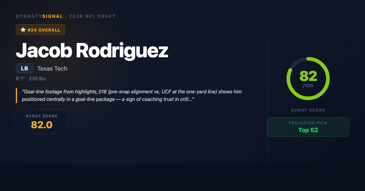 Scout1 Assessment Jacob Rodriguez is the most decorated linebacker in college football history for a single season — Butkus, Bednarik, Nagurski, and Lombardi Trophy winner in the same year, plus 5th in Heisman voting — and that résumé barely does the film justice. He's a cerebral, instinct-driven MIKE/WILL hybrid who produces turnovers at a historically unprecedented rate: 7 forced fumbles (tied the single-season NCAA record) plus 4 interceptions in 2025 alone, on top of leading Texas Tech in tackles. The case ag...