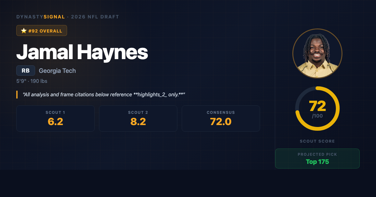 Scout1 Assessment Jamal Haynes is a compact, lightning-quick speed back who is at his absolute best in open space β the kind of player who makes crowd gasps happen when he gets into the second level. His receiving ability out of the backfield adds a genuine second dimension that will generate NFL interest beyond pure rushing value. The case against: he's undersized for the position by NFL standards, he'll be a liability in pass protection until proven otherwise, and the ACC isn't exactly the proving ground for ph...