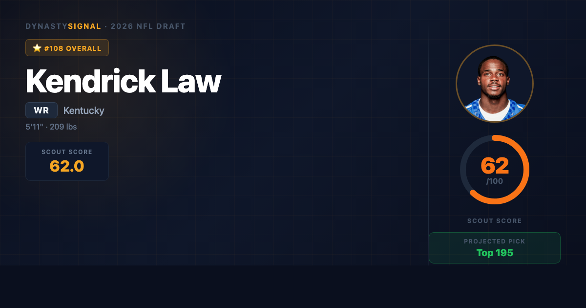 Scout1 Assessment Kendrick Law is a compact, thickly-built speed receiver who transferred from Alabama to Kentucky in 2025 and immediately became the Wildcats' top target — 53 catches, 540 yards, and 3 TDs in 12 starts, plus Shrine Bowl recognition. The case for Law is simple: legitimate 4.4 speed in a 209-pound frame, a real YAC ceiling, proven kick return value, and the credibility of three seasons inside Nick Saban's and Kalen DeBoer's Alabama program before arriving in Lexington. The case against is equally c...