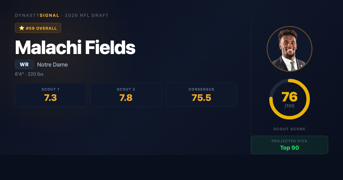 Scout1 Assessment Malachi Fields is a throwback X-receiver โ 6'4", 218 lbs โ who wins the old-fashioned way: size, physicality, catch radius, and the willingness to fight for 50/50 balls that most receivers his size don't attempt. He spent four productive seasons at Virginia building a 165-catch, 2,479-yard career before transferring to Notre Dame for his final year and emerging as a Senior Bowl standout. The case for him is straightforward: there aren't many WRs at this size who can high-point the football, run ...