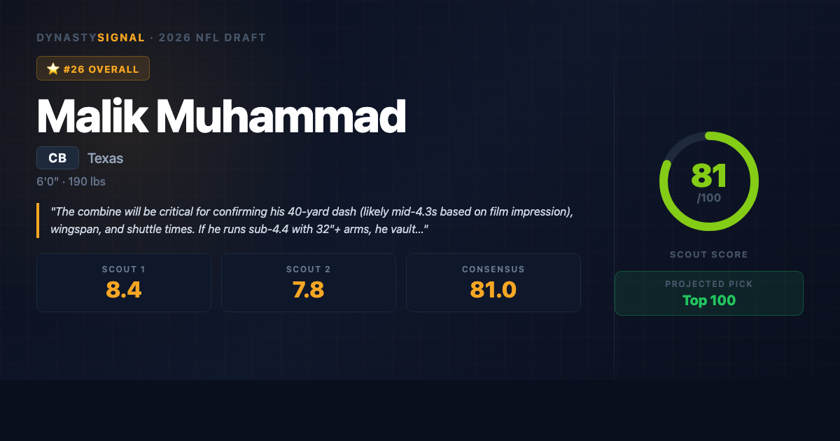 Scout1 Assessment Malik Muhammad is the rare cornerback prospect who combines boundary-caliber size with nickel versatility, elite length for his frame, and a genuine willingness to play the run β he's not just a coverage corner, he's a complete defender. The case for: at 6'0" with reportedly freaky arm length, he passes the prototype test, and SEC competition didn't faze him for a single game he was featured in; he made tackles against Florida, held his own at Ohio State, and even blitzed his way to a sack in th...