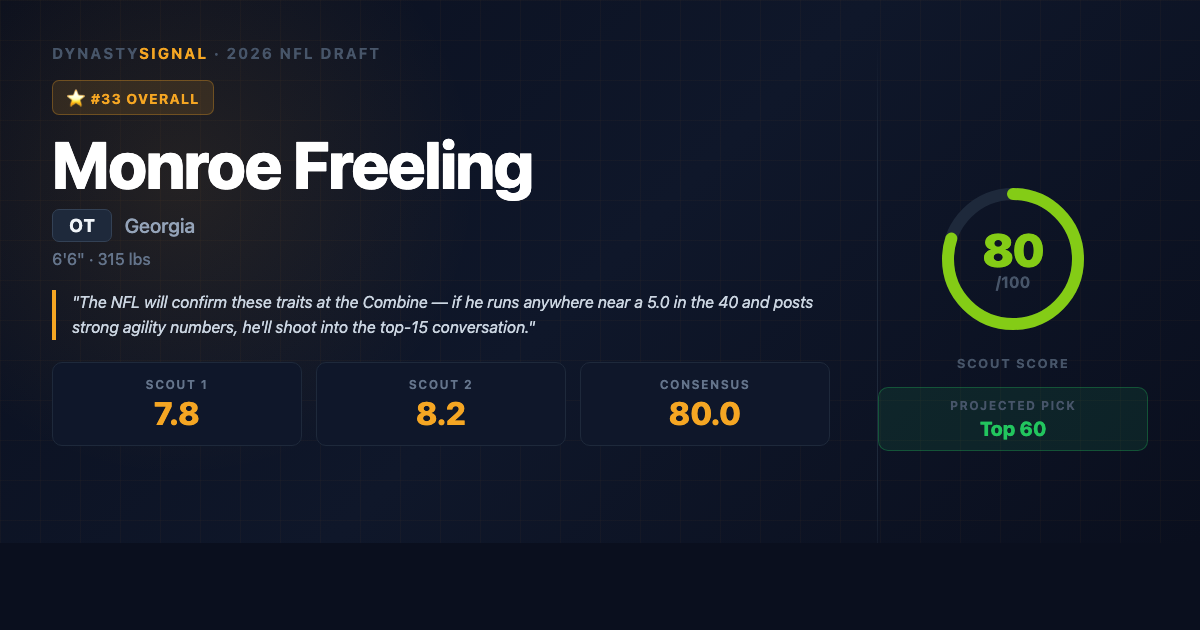 Scout1 Assessment Monroe Freeling is a long, athletic left tackle out of Georgia who plays with legitimate first-round physical tools and the kind of movement ability that makes offensive line coaches drool. At 6'6", 315 pounds, he combines genuine anchor strength with the rare capacity to pull and block in space โ a combination that makes him a day-one asset in both zone and power running systems. The case for him is straightforward: elite frame, smooth kick-slide in pass pro, and high-effort finishing ability a...