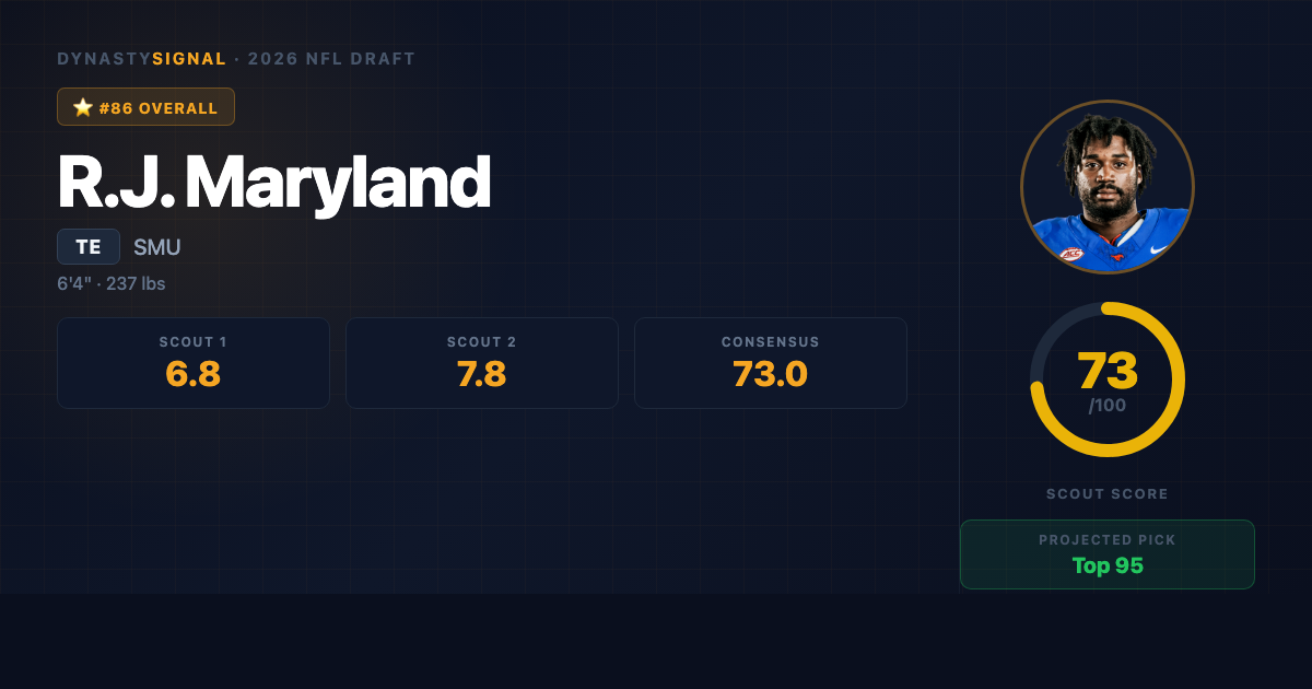 In dynasty, Maryland's value is a bet on a specific outcome: clean combine testing, a full-speed 2025 return, and a landing spot in a pass-heavy offense that deploys moveable tight ends rather than traditional Y blockers. If all three break right, his receiving upside from 2023 (54/518/7 TDs) understates the ceiling โ he was doing that in the AAC before the injury, and his 2024 ACC film showed he was ready to take the next step before the knee ended it. The ideal NFL home is something in the mold of Kansas City or San Francisco โ a scheme that creates seam stress through formation flexibility and wants a tight end who can go from in-line on 1st and 10 to isolated in the slot on 3rd and 6 without a substitution.