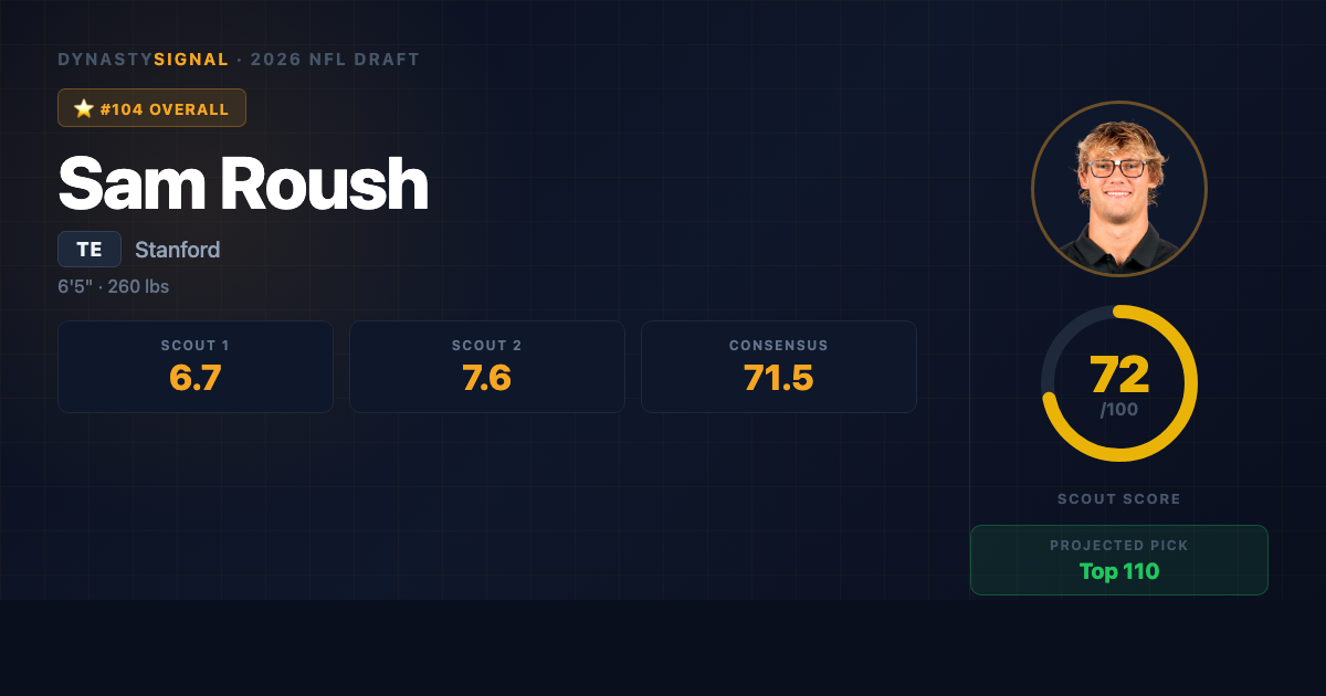 Scout1 Assessment Sam Roush is a classic Stanford tight end โ smart, sure-handed, consistently productive, and genuinely two-way. The 6'5", 260-pound senior capped a four-year career with All-ACC Second Team honors and career highs in every major receiving category, operating as the unambiguous offensive hub on a team that struggled to win games. He won't dazzle you on a route-running clinic tape, but what he does โ stack defenders at the line, create width on seam routes, and turn short catches into chunk plays ...