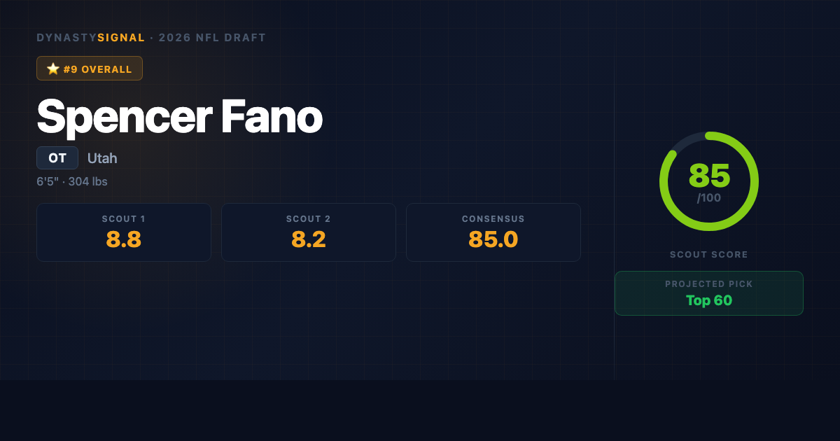 Scout1 Assessment Spencer Fano is the rare offensive tackle prospect who arrives in the 2026 draft with the body, the rรฉsumรฉ, and the tape to justify first-round buzz โ as a redshirt sophomore. He's a mauler-first tackle who dominates in the run game and anchors reliably in pass protection, having surrendered just **1 sack on 406 pass block attempts** in 2024, good enough for a 98.2 PBE and a First Team All-Big 12 selection. The case for him is simple: elite run-blocking grades (93.6 PFF), legitimate tackle size ...