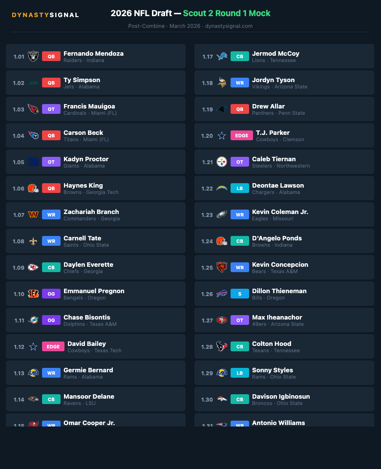 The QB room looks different here. Ty Simpson at No. 2 is a pure Scout 2 statement pick โ the processing and anticipation show up on tape, but Scout 1 might not love him this high without an elite combine athletic floor. Scout 2 rewards what you see on film AND confirms it's real.